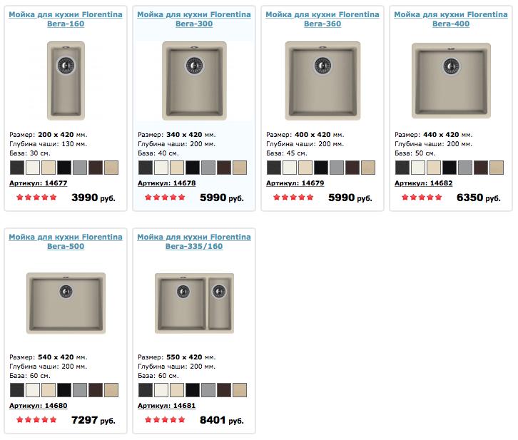 Мойки для кухни Флорентина Вега обладают всеми достоинствами изделий из натурального гранита, но отличаются большей износостойкостью, прочностью и долговечностью. Они имеют следующие размеры:
