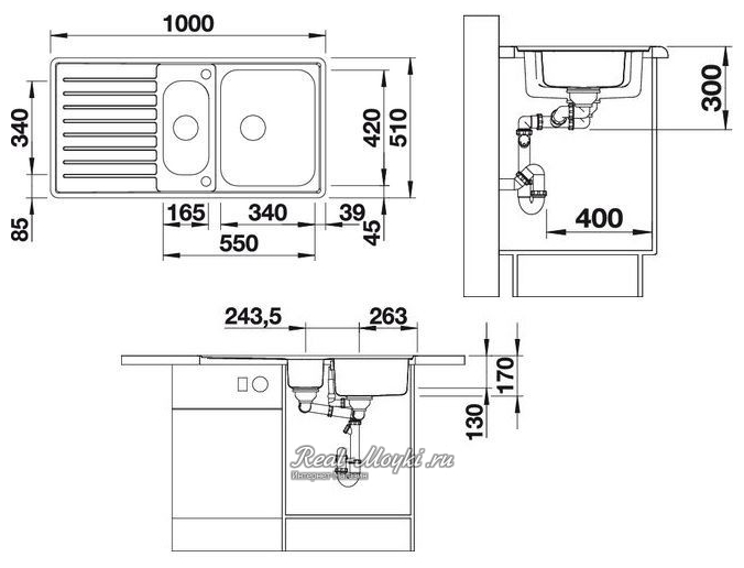 База для встраивания кухонной мойки — в этом параметре указывается минимальный размер шкафа, куда будет устанавливаться мойка. Ширина базы/шкафа может быть меньше ширины мойки, так как крыло мойки может заходить на соседний предмет.