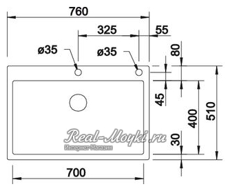 Внешний размер мойки - 800х500 мм. Размер отверстия под данную мойку - 780х480 мм.