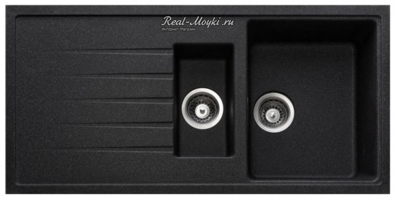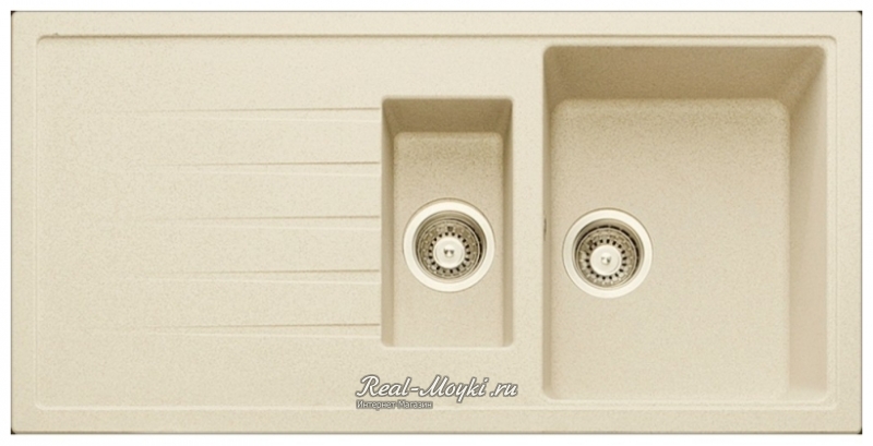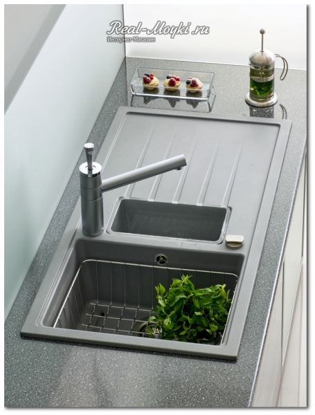 Оригинальная двойная мойка, которая позволяет сочетать повышенную функциональность с компактными размерами. Одна основная чаша тут имеет крупные размеры. Она предназначена для мытья посуды и других стандартных операций. Вторая чаша довольно компактна, часто - ещё и меньше по глубине. В ней можно сушить столовые приборы и посуду, размораживать полуфабрикаты и т.д. Некоторые модели несмотря на расширенную функциональность по размерам лишь немногим превосходят одночашевые вариации, что делает такие мойки отличным решением для мало- и средне габаритных кухонь.