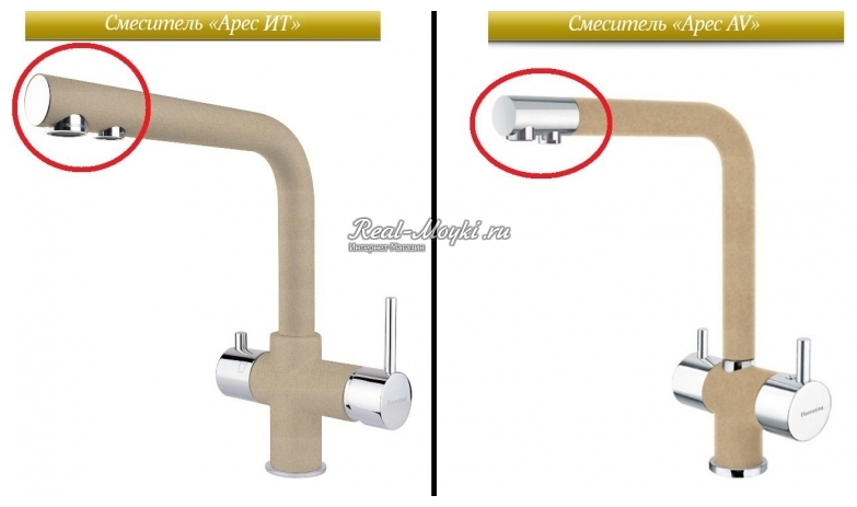Такие смесители оснащены двумя изливами или же одним изливом, но с двумя каналами. Такие модели имеют специальный переключатель, позволяющий выбирать вариант подачи воды - напрямую из водопровода или через фильтр очистки.