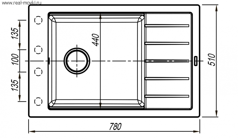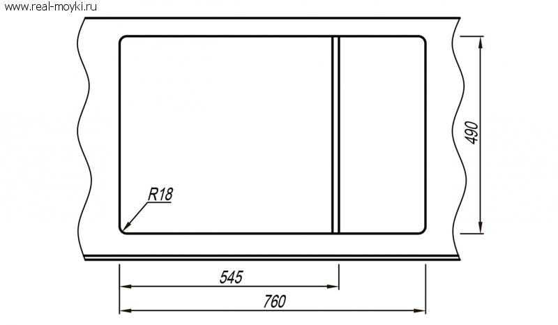 Внешний размер мойки - 800х500 мм. Размер отверстия под данную мойку - 780х480 мм.