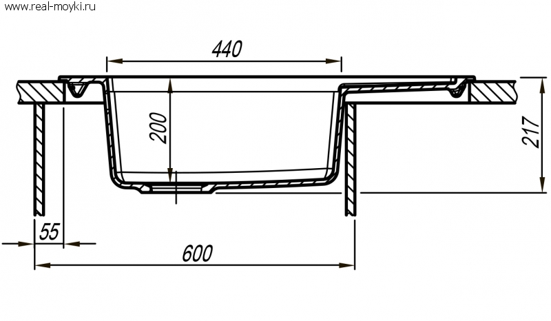 База для встраивания кухонной мойки — это минимально допустимое расстояние между боковыми (левой и правой) стенками кухонного шкафчика (его ширина), куда будет устанавливаться чаша мойки (именно чаша мойки, а не вся мойка).