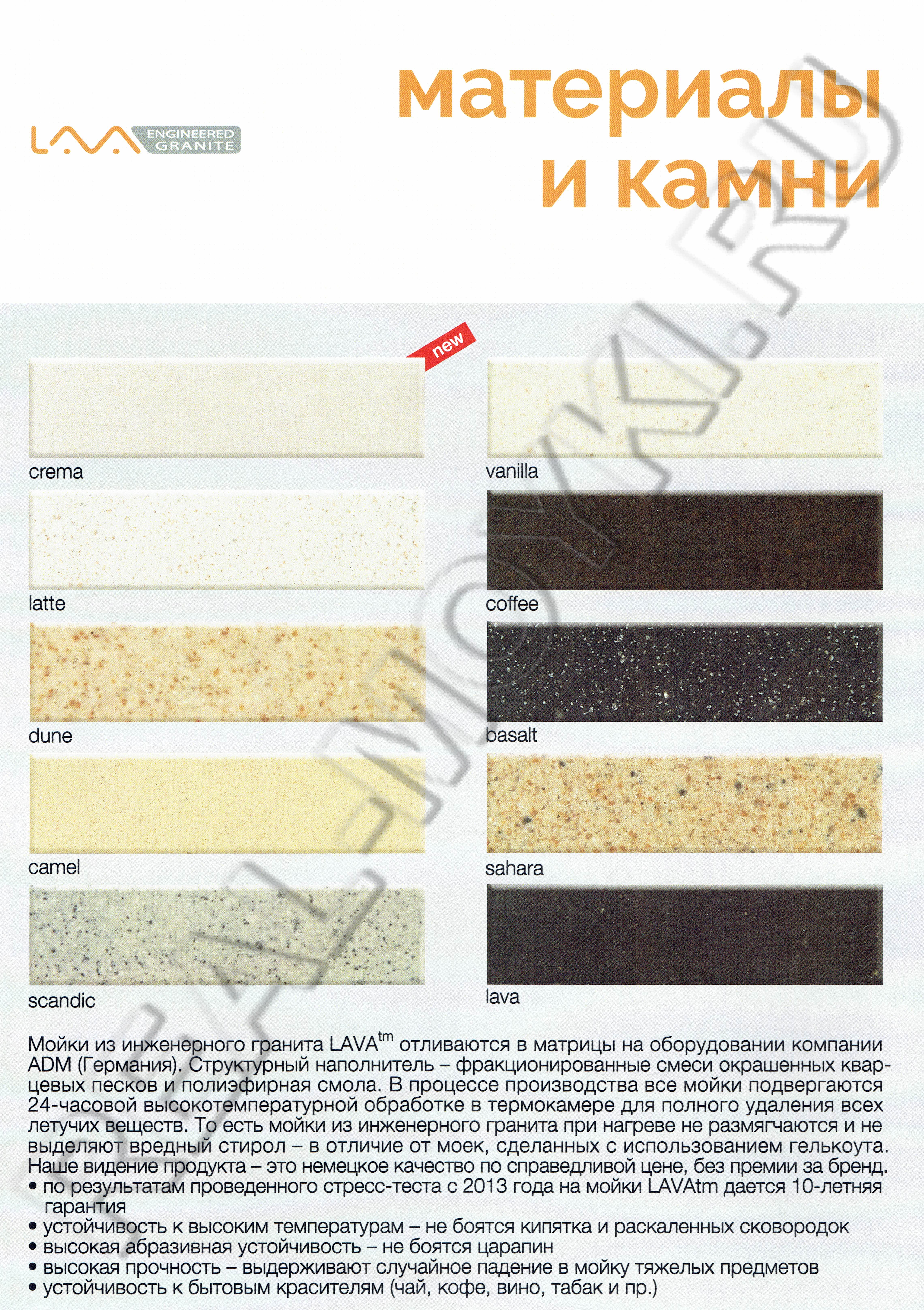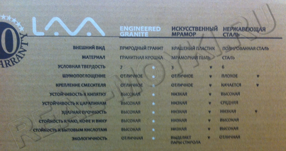Такой материал имеет не пористую структуру, что позволяет с легкостью мыть мойку Лава L1. Он не поддается температурным перепадам, тут можно ставить как горячий предмет, так и с легкостью размораживать продукты не опасаясь последствий.Гранитная мойка не царапается и не боится ударов.