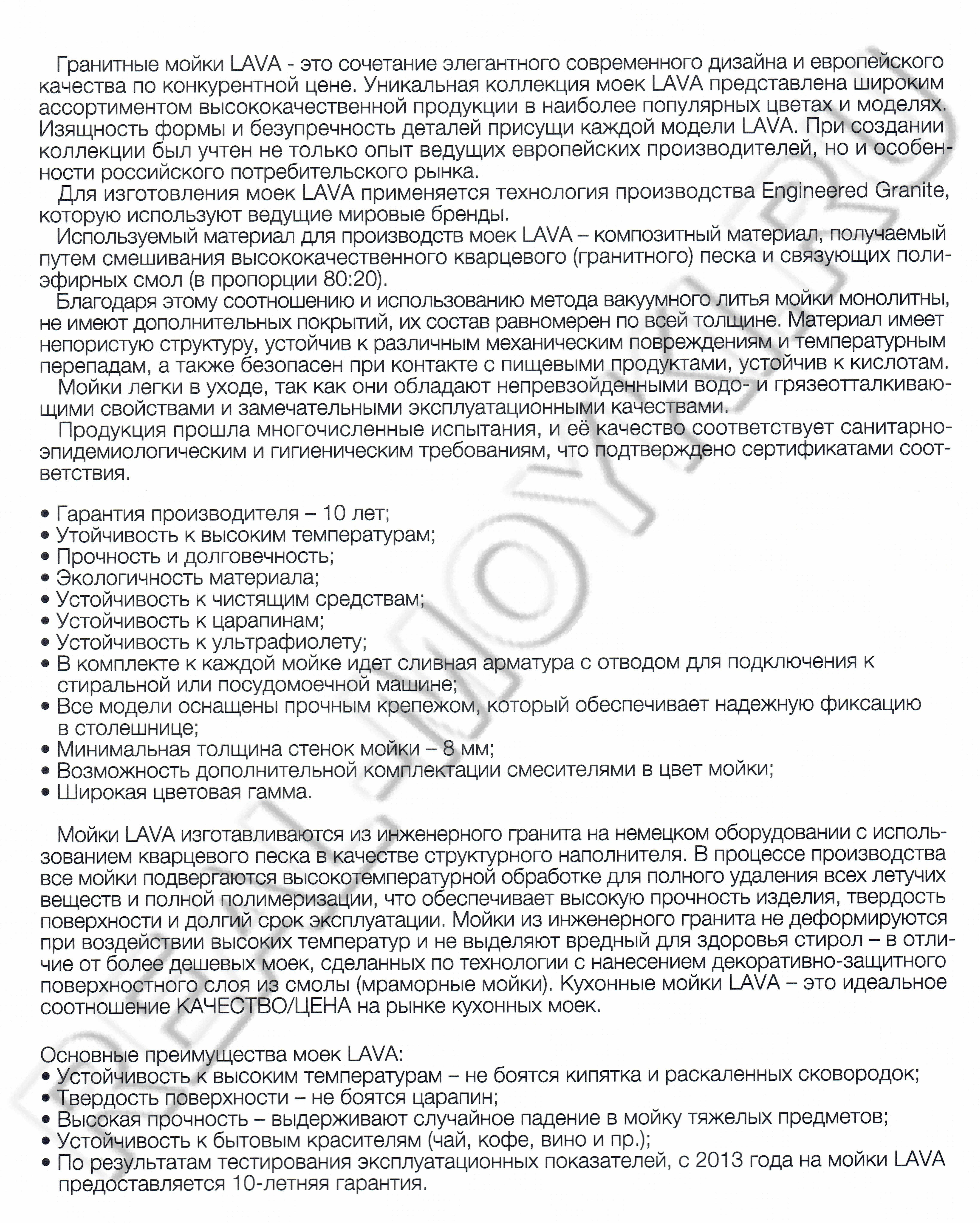 Мойка Lava L1 изготовлена из крепкого материала, который позволяет использовать её на протяжении длительного время. На кухне мойка будет выглядеть постоянно новой, так как производитель очень заботиться о внешнем виде своего товара и использует новые технологии в производстве.