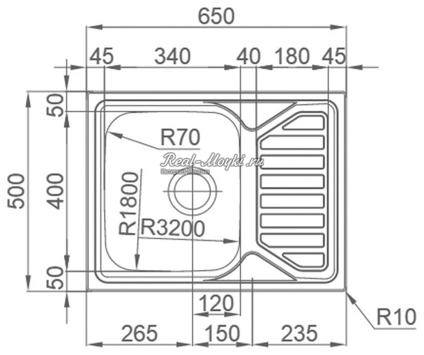 Как правило размер отверстия под мойку на 2 см (20 мм) меньше внешнего размера мойки.