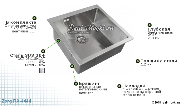 Мойка из нержавеющей стали квадратной формы Zorg RX-4444 никого не сможет оставить совершенно равнодушным к этой потрясающей продукции в современном мире необходимой техники для вашей дорогой кухни.