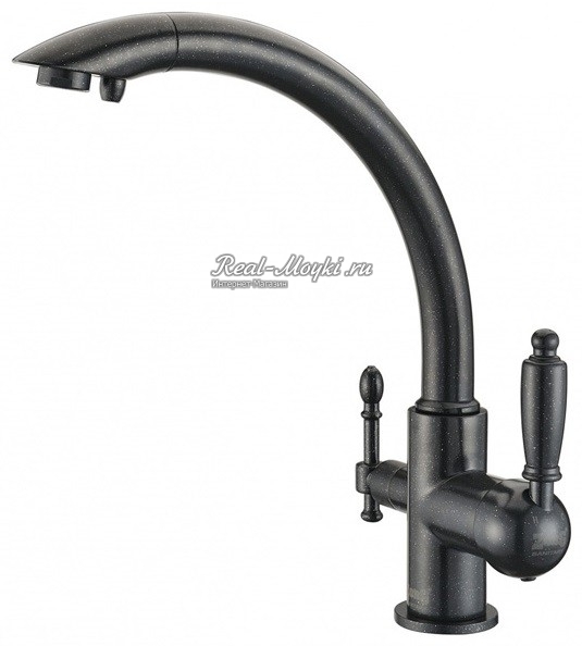Смесители под гранит: сделаны из латуни с гальваническим цветным покрытием. Поэтому и цветовая гамма такая большая. Визуально смесители с покрытием под гранит не будут отличаться от гранитных моек, главное подобрать цвет. Такие смесители имеют всегда основной цвет и мелкие цветные вкрапления, к примеру, черный металлик – это черный смеситель с металлическими вкраплениями.