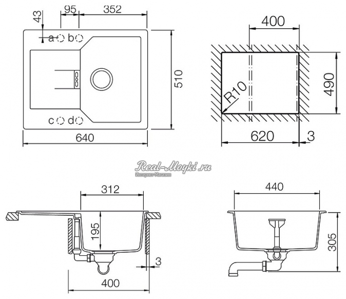 Как правило размер отверстия под мойку на 2 см (20 мм) меньше внешнего размера мойки.