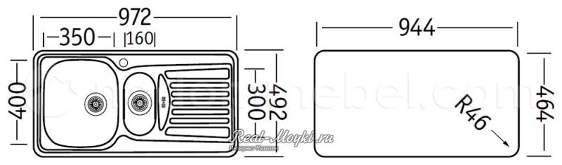 База для встраивания кухонной мойки — в этом параметре указывается минимальный размер шкафа, куда будет устанавливаться мойка. Ширина базы/шкафа может быть меньше ширины мойки, так как крыло мойки может заходить на соседний предмет.