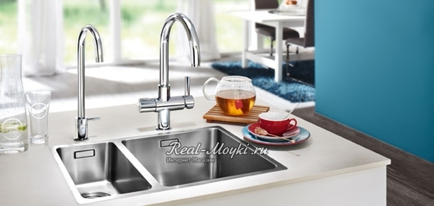 Стандартный смеситель Grohe Blue Pure 33249001 из хрома с высоким изливом – это отличный вариант из всех предлагаемых устройств для кухонной мойки. Он обладает определенными яркими достоинствами.