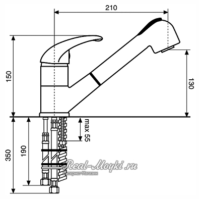 Высота излива это вертикальное расстояние между основанием смесителя и аэратором (рассекателем). При выборе высоты излива важно учитывать, что слишком низкий излив, может затруднять мытье габаритной посуды, а очень высокий излив, может вызывать разбрызгивание воды.