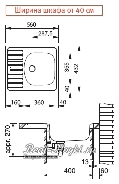 База для встраивания кухонной мойки — в этом параметре указывается минимальный размер шкафа, куда будет устанавливаться мойка. Ширина базы/шкафа может быть меньше ширины мойки, так как крыло мойки может заходить на соседний предмет.