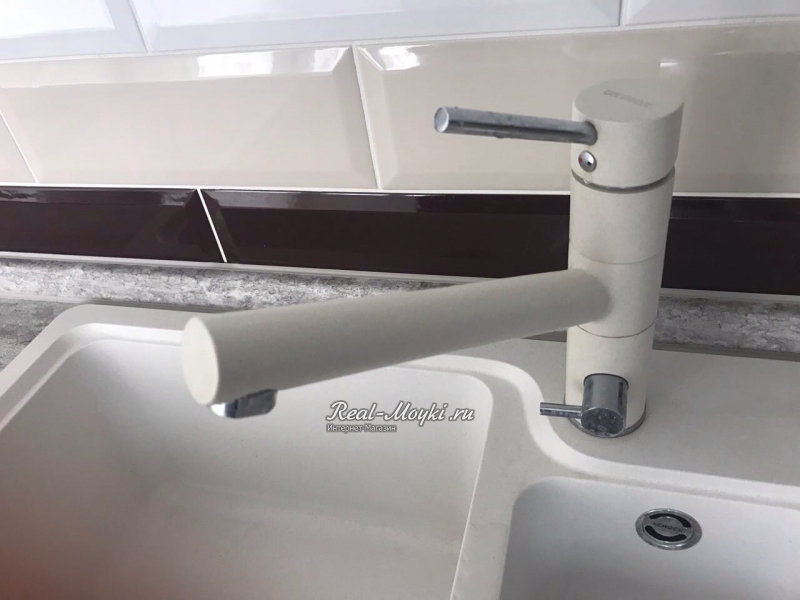 Смесители под гранит: сделаны из латуни с гальваническим цветным покрытием. Поэтому и цветовая гамма такая большая. Визуально смесители с покрытием под гранит не будут отличаться от гранитных моек, главное подобрать цвет. Такие смесители имеют всегда основной цвет и мелкие цветные вкрапления, к примеру, черный металлик – это черный смеситель с металлическими вкраплениями.