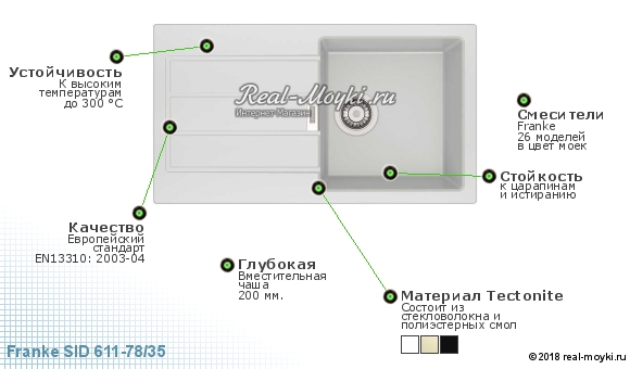 Купить прямоугольную кухонную мойку Франке Сид 611 78/35 в интернет магазине www Real-Moyki ru по лучшей цене - это быть уверенным в правильности сделанного выбора в пользу изделия. Ведь мы предложим вам не только цены от производителя, но и полную, достаточно длительную гарантию от Франке, которая покроет все, чтобы не случилось с вашей мойкой, хотя, учитывая высокие стандарты качества, это маловероятно.