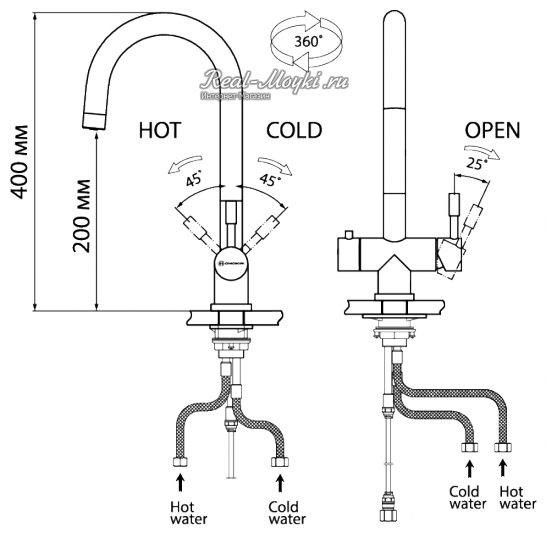 Такие смесители оснащены двумя изливами или же одним изливом, но с двумя каналами. Такие модели имеют специальный переключатель, позволяющий выбирать вариант подачи воды - напрямую из водопровода или через фильтр очистки.