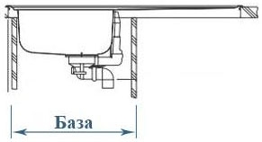 База для встраивания кухонной мойки — в этом параметре указывается минимальный размер шкафа, куда будет устанавливаться мойка. Ширина базы/шкафа может быть меньше ширины мойки, так как крыло мойки может заходить на соседний предмет.