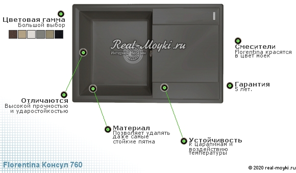 Все Мойки для кухни Florentina, расположенные на страницах нашего магазина, в то числе и модель Консул 760, обладают сертификатами качества производителя, помимо чего, вместе с купленным товаром, каждый наш клиент получает длительную гарантию от производителя, которая способна защитить его от любых проблем, связанных с эксплуатацией покупки.