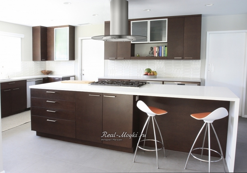 Стоит отметить один яркий аспект этого товара: он отлично подойдет кухонному пространству больших, значительных размеров, благодаря своеобразию своего месторасположения. Его размещают, примерно, в центре комнаты. Это очень удобно, ведь в этом варианте поток чистого воздуха будет активно циркулировать по всей площади, это обеспечит высокую эффективность процесса работы.