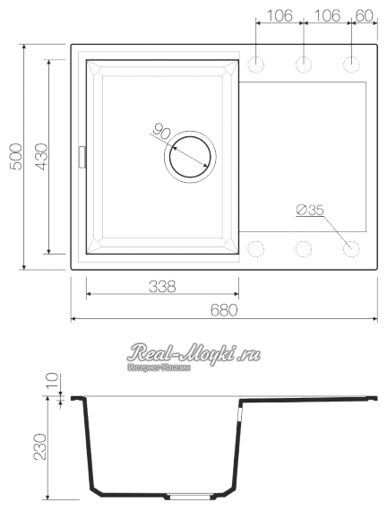 Вся технология получения материала и готовых изделий данного японского производителя запатентована в 2014 году и по праву считается одной из наиболее прогрессивных на рынке кухонных сантехнических изделий мира.Врезная мойка Omoikiri Sakaime 68 имеет прямоугольную форму, в ширину достигает 680 мм (при этом минимальная база для встраивания равна лишь 40 см). Изделие имеет чашу правильной формы с глубиной в 230 мм. Тут легко поместится крупная утварь и посуда, а вода точно не будет разбрызгиваться, когда включен смеситель. Второй функциональный элемент - прямоугольное крыло с бортиками, которые позволяют воде попадать только в раковину. Тут можно сушить посуду и продукты, размораживать мясо и полуфабрикаты, выполнять различные кухонные операции - делать нарезку, готовить блюда, смешивать ингредиенты в специальной посуде и т.д.