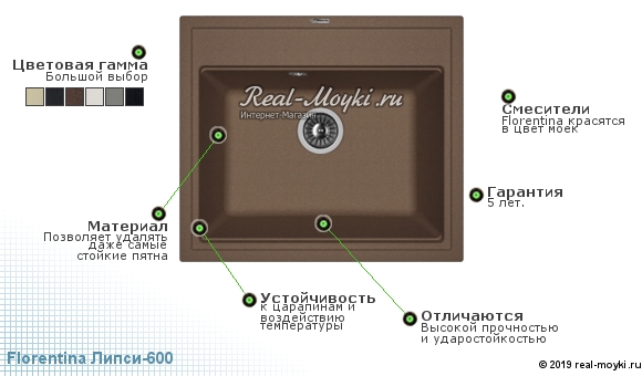 Не знаете, где купить кухонную мойку Florentina Липси-600? Тогда интернет-магазин Real-Moyki к вашим услугам. Вас ждет большой ассортимент цветовых решений - девять вариантов, привлекательная стоимость и первоклассный сервис. Наша компания является сертифицированным представителем российского производителя Флорентина, поэтому вы гарантировано получите качественную, практичную, надежную, современную сантехнику с оперативной доставкой в любой город России.